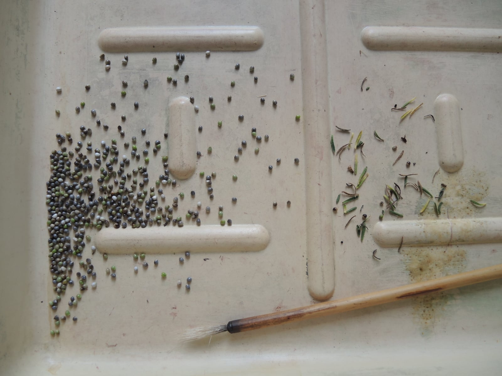 分枝から種を落とす作業は、1〜3粒毎固い音を響かせバット(vat) 内に集まります。長い1分枝には50粒を超える種子が付き、種子1〜4粒の萼を指先で押さえてバット(vat)内に落とします。