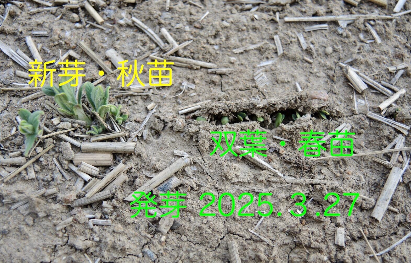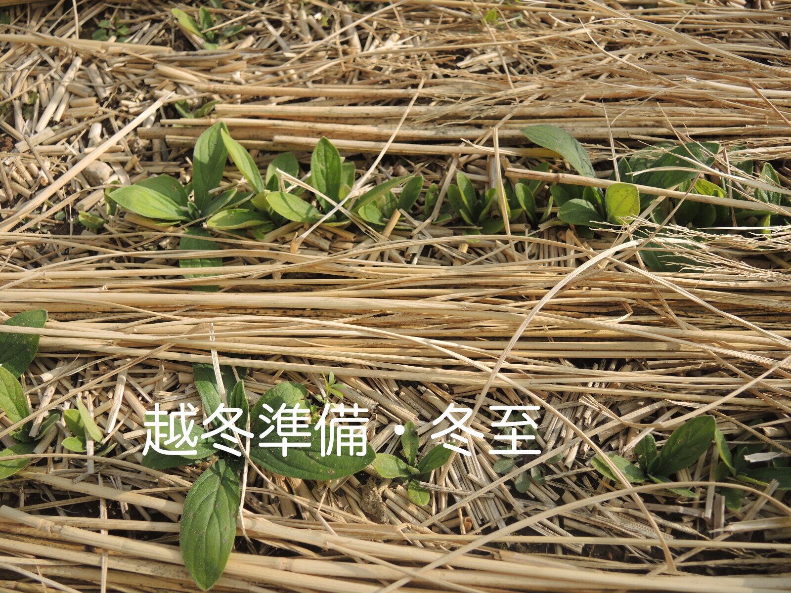 霜柱が出る寒冷地では苗は、抜けてしまいますので越冬対策として、藁束等で苗床を覆います。温暖地域では、発芽した苗は冬場 地上部は枯れますが、春先に双葉とは異なる新芽が出て生育し、間も無く定植苗となります。発芽しなかった種も地を割って、双葉苗が発芽して来ます(定植まで本葉3〜4枚まで苗床にて生育を待ちます)。